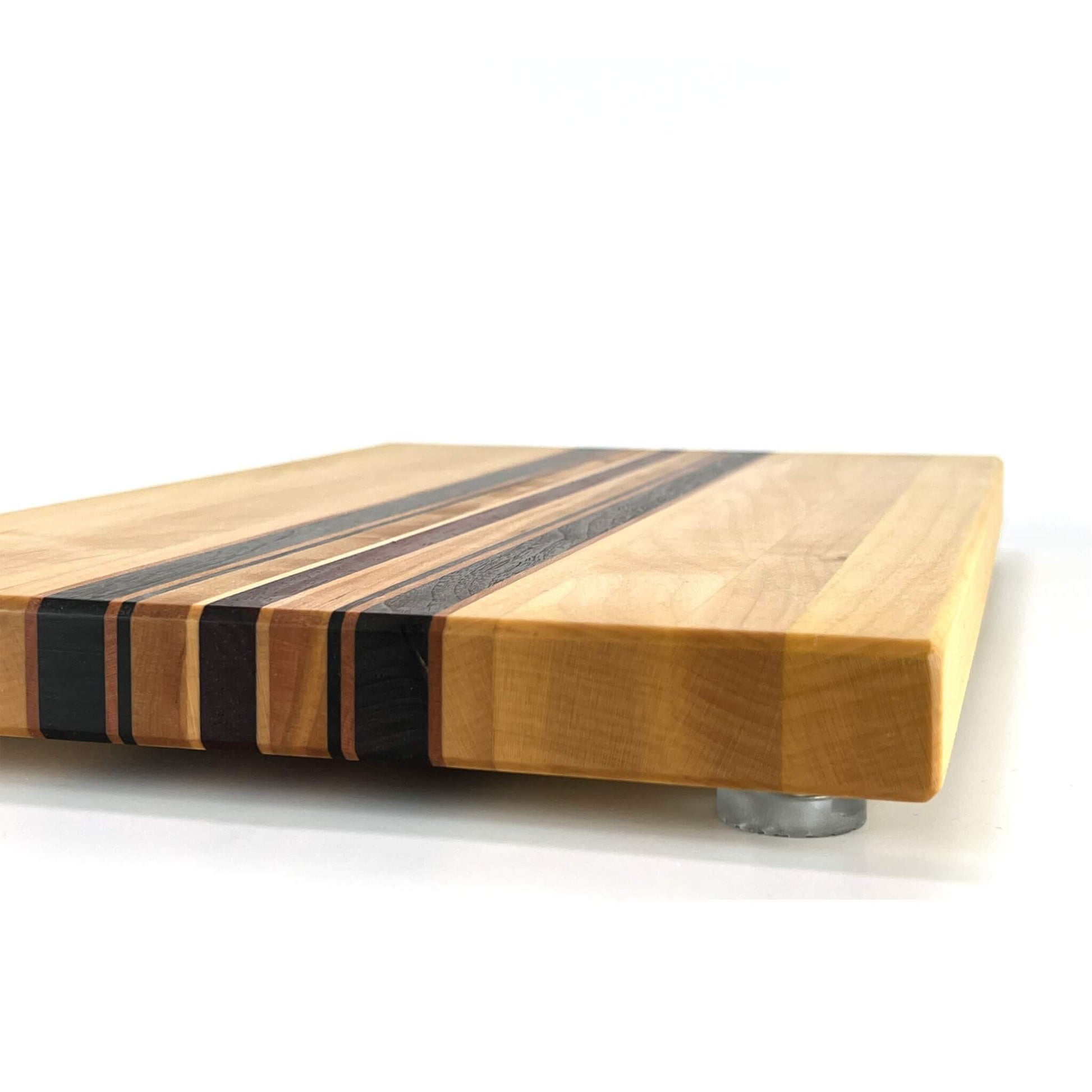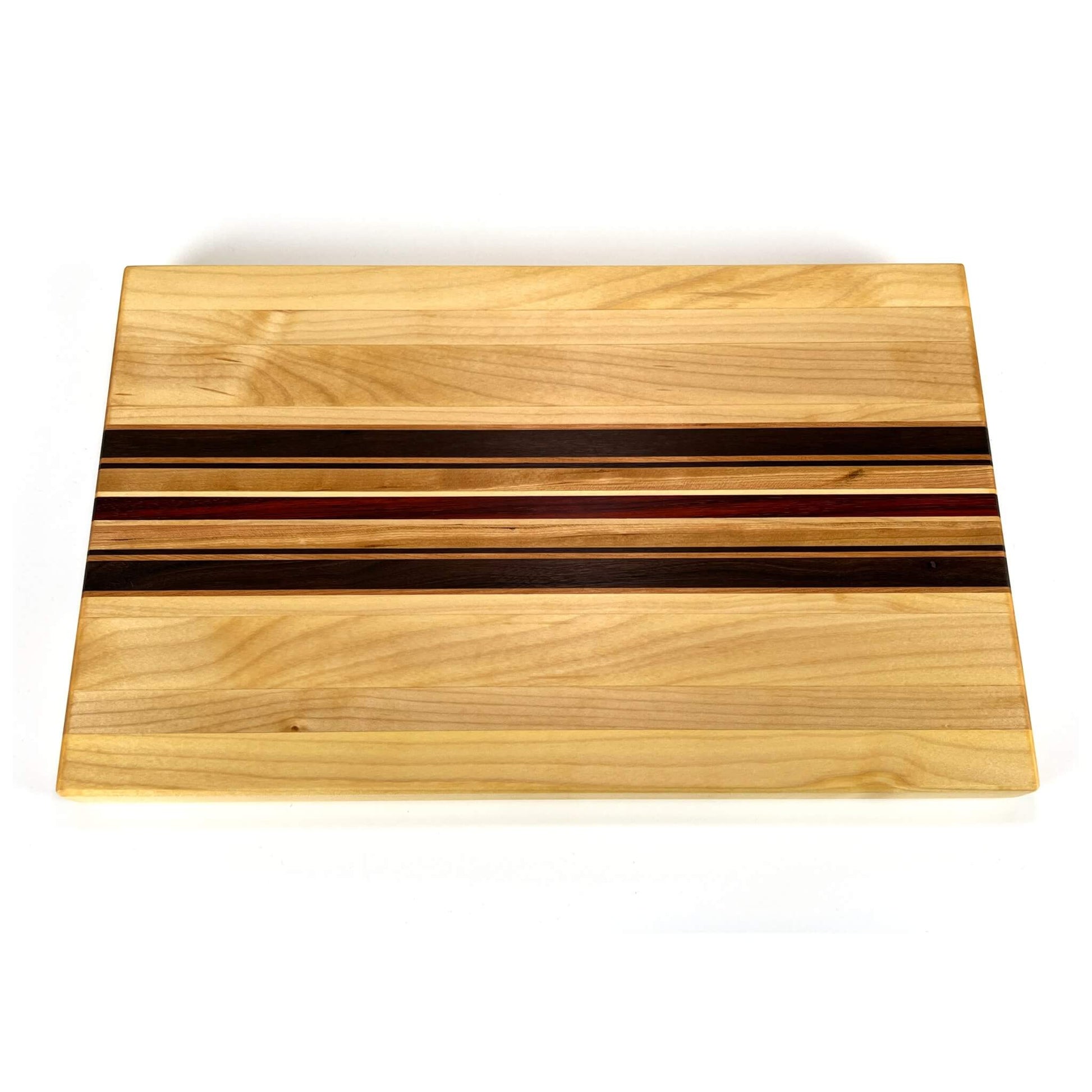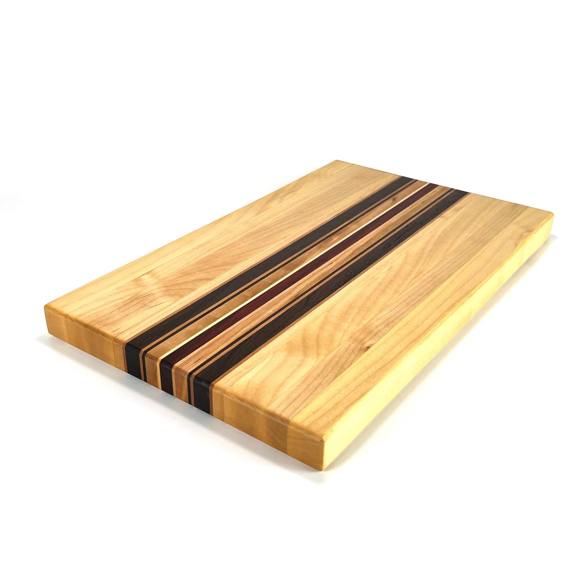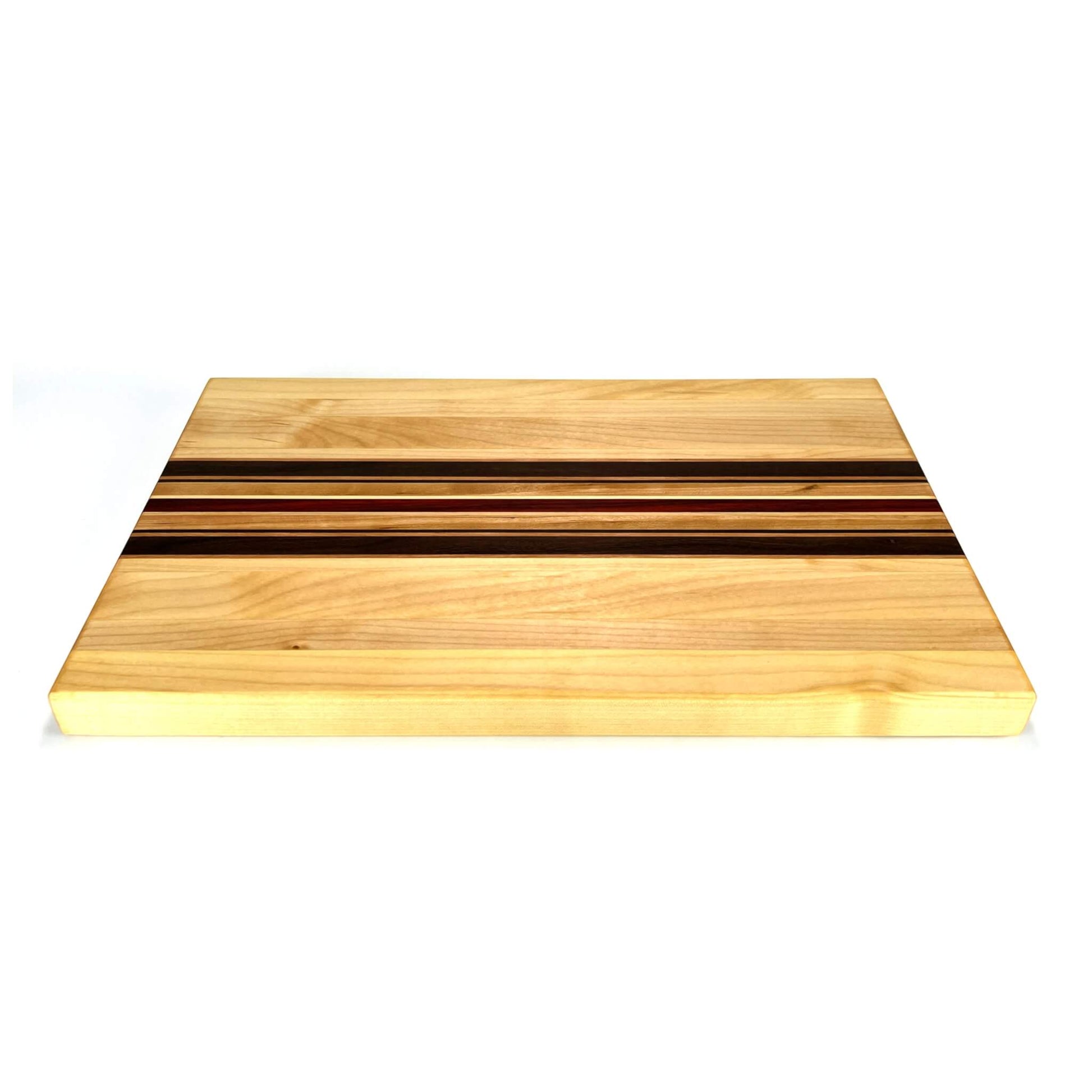 Langholzschneidebrett aus europäischem Ahorn und Kirschbaum, amerikanischem Nussbaum und afrikanischem Padouk.