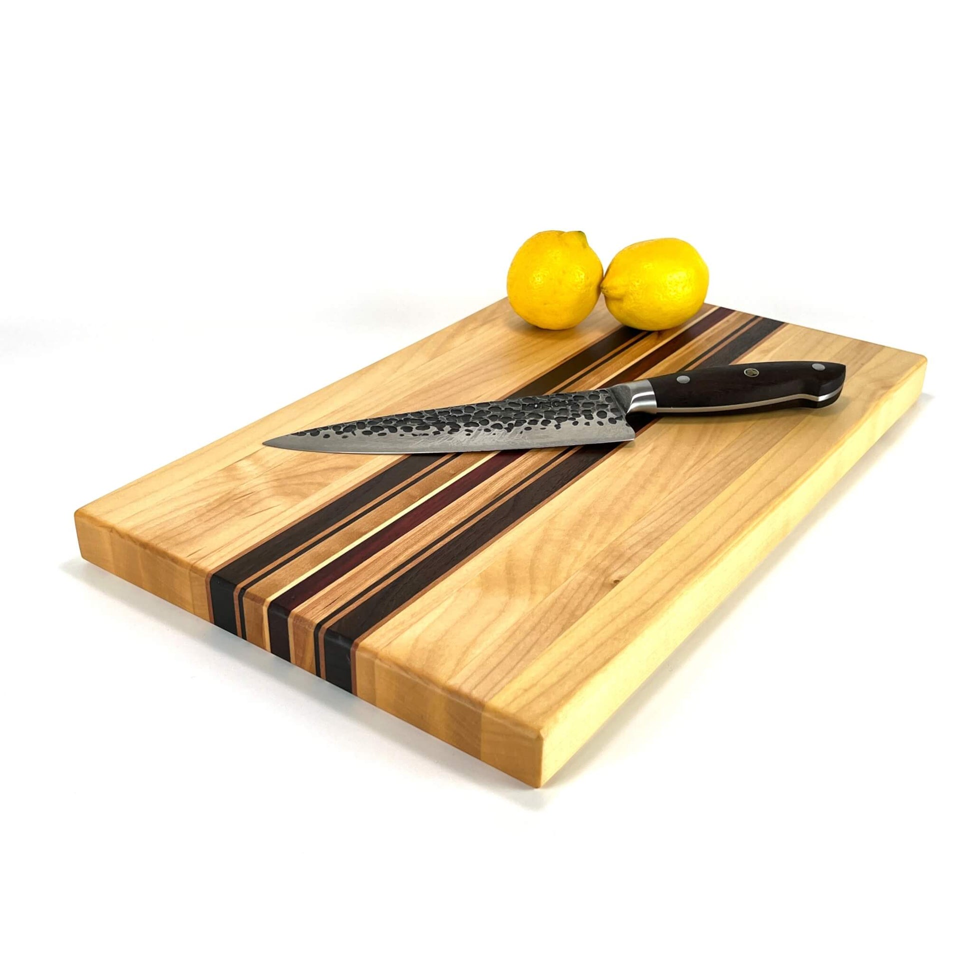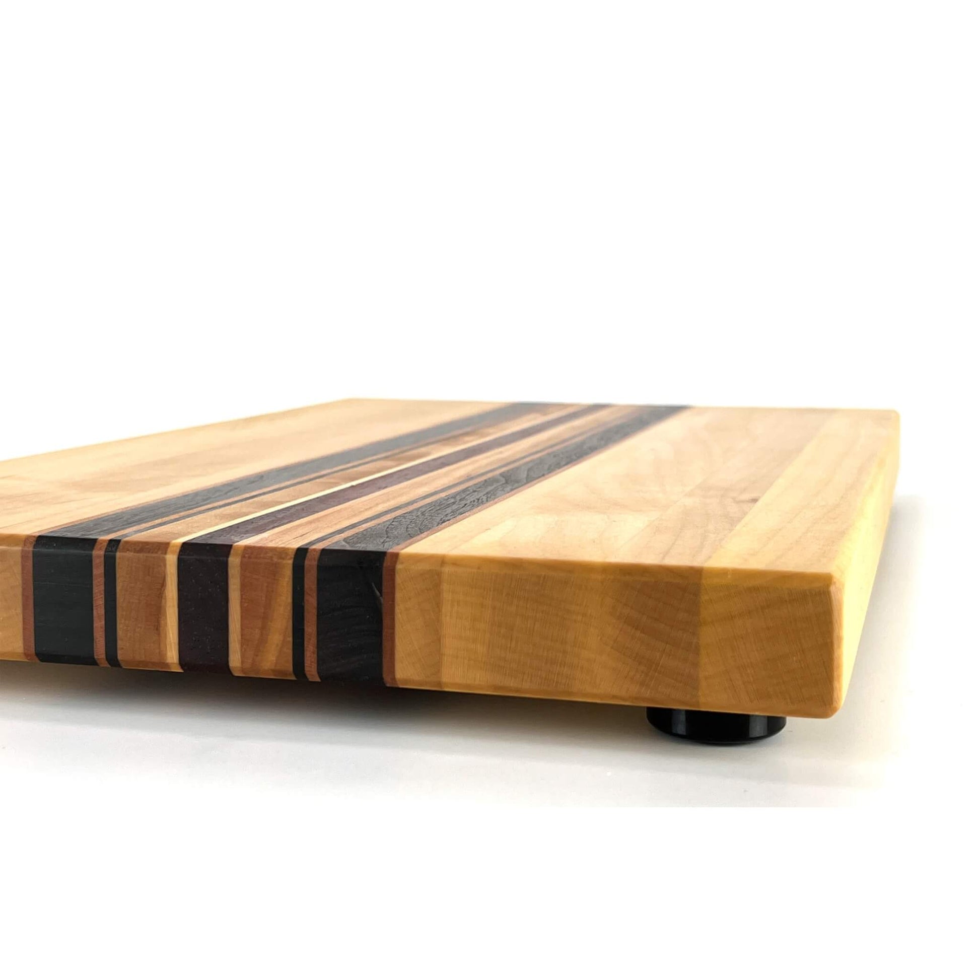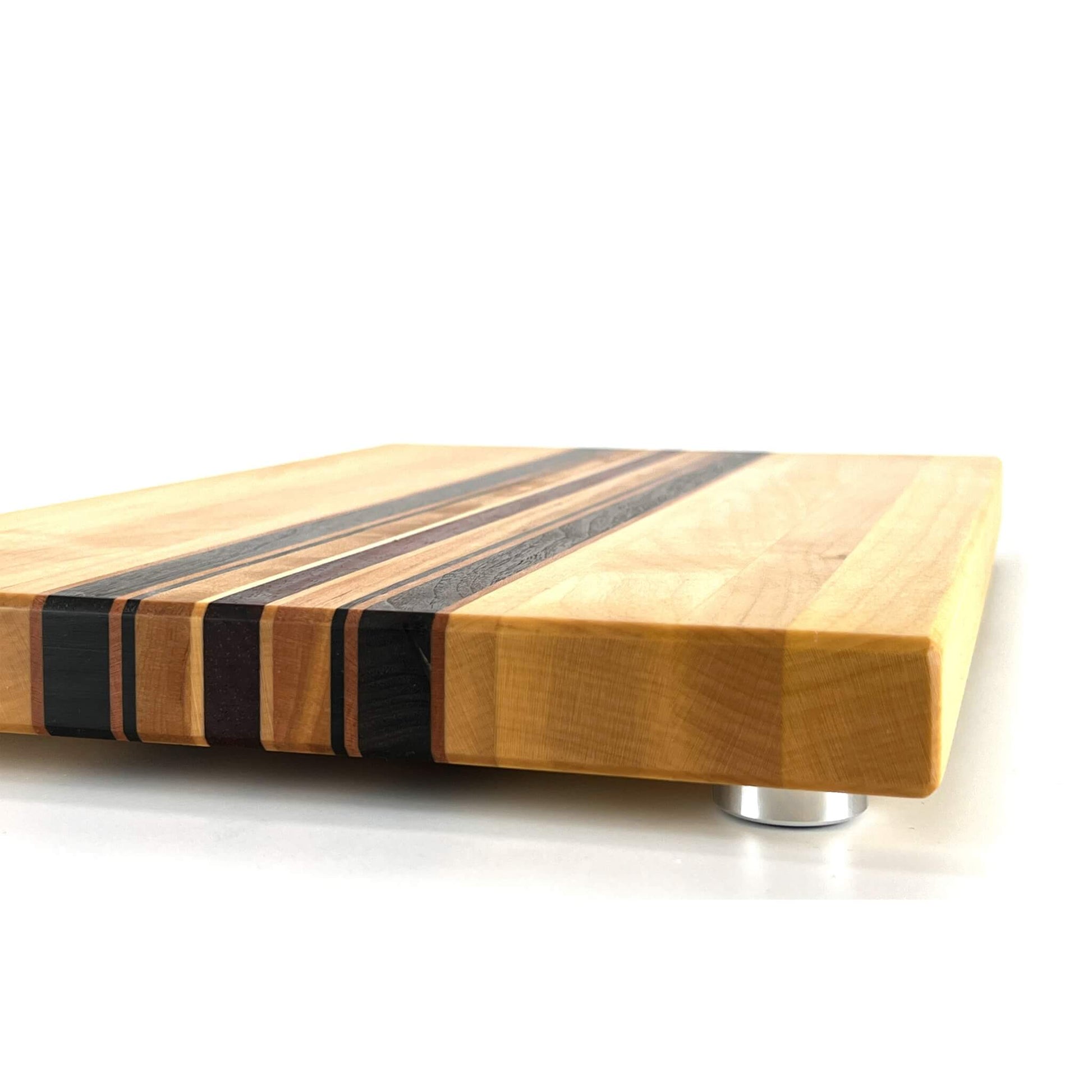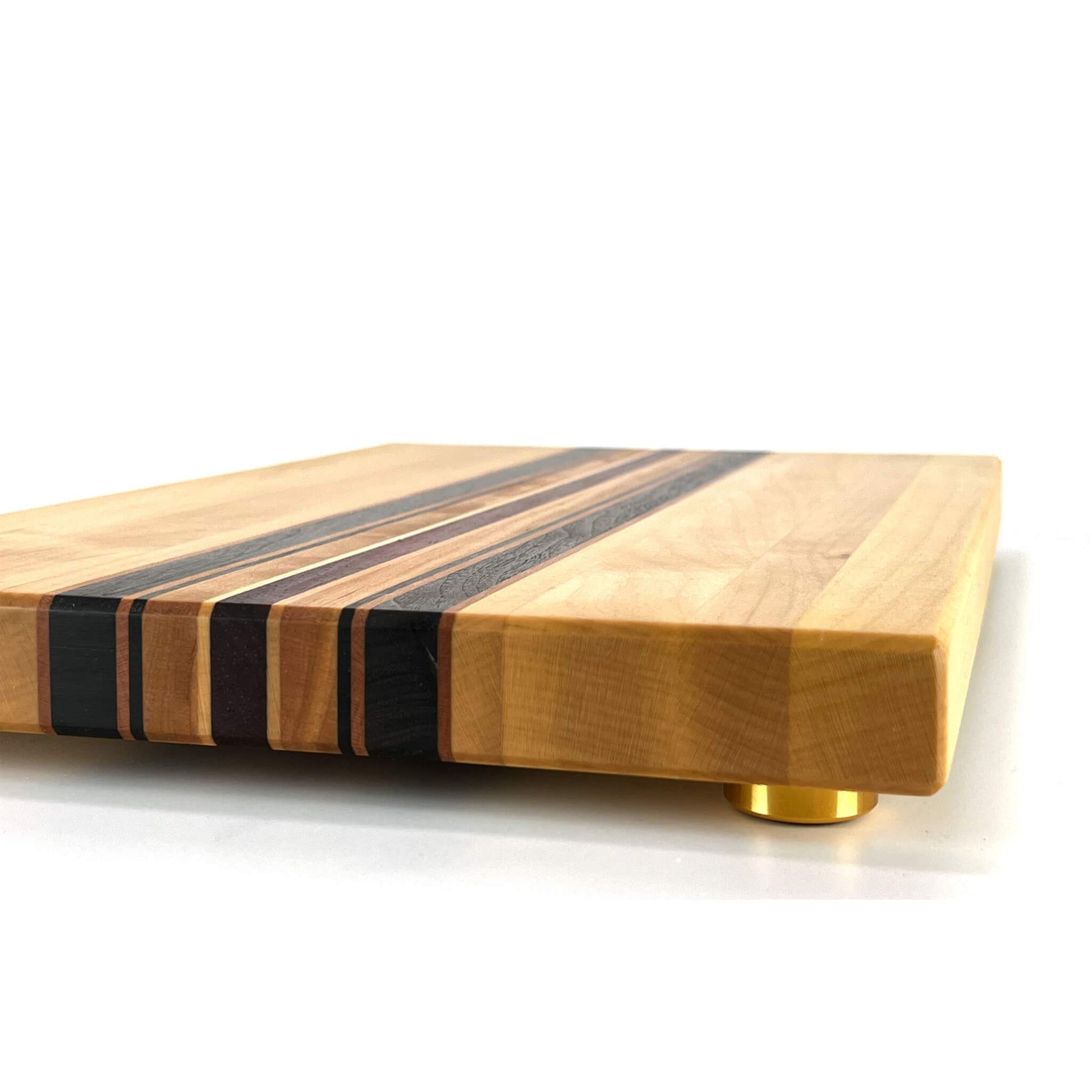 Langholzschneidebrett aus europäischem Ahorn und Kirschbaum, amerikanischem Nussbaum und afrikanischem Padouk.